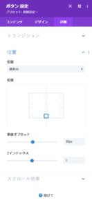 で、その「ボタン」モジュールの「詳細」→「位置」を「絶対の」にして位置を下の真ん中にする。